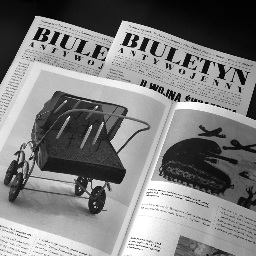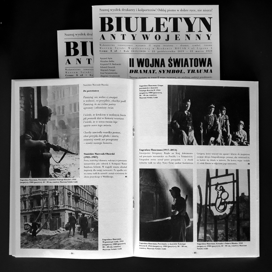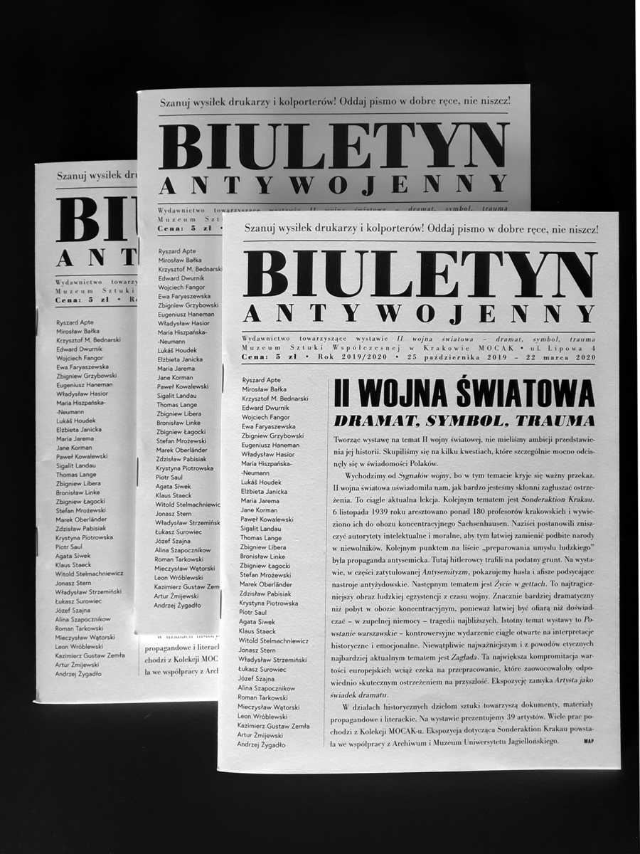 The Anti-War Bulletin that accompanies the exhibition World War II – Drama, Symbol, Trauma with its graphic design echoes newspapers of the 1920s and 1930s. It has been subdivided into sections titled after parts of the exhibition, in the order of display: Portents of War, Anti-Semitism, Sonderaktion Krakau, Life in the Ghettos, The Warsaw Uprising, The Holocaust and Artist as a Witness to the Drama. The reader will find curatorial texts by Maria Anna Potocka, reproductions of works with descriptions, poems, fragments of source texts and comments by the social psychologist Professor Michał Bilewicz on examples of propaganda from the 1930s and the war time, as well as fact and comments by the historian Jan Jakub Grabowski.