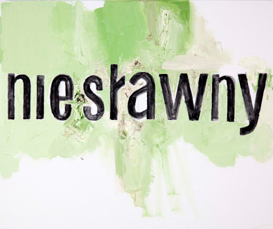 From the mass of thickly laid off paint, there emerge words taken out of context and deliberately crooked.