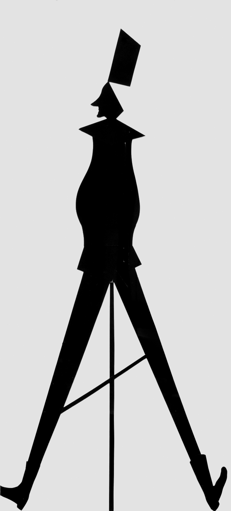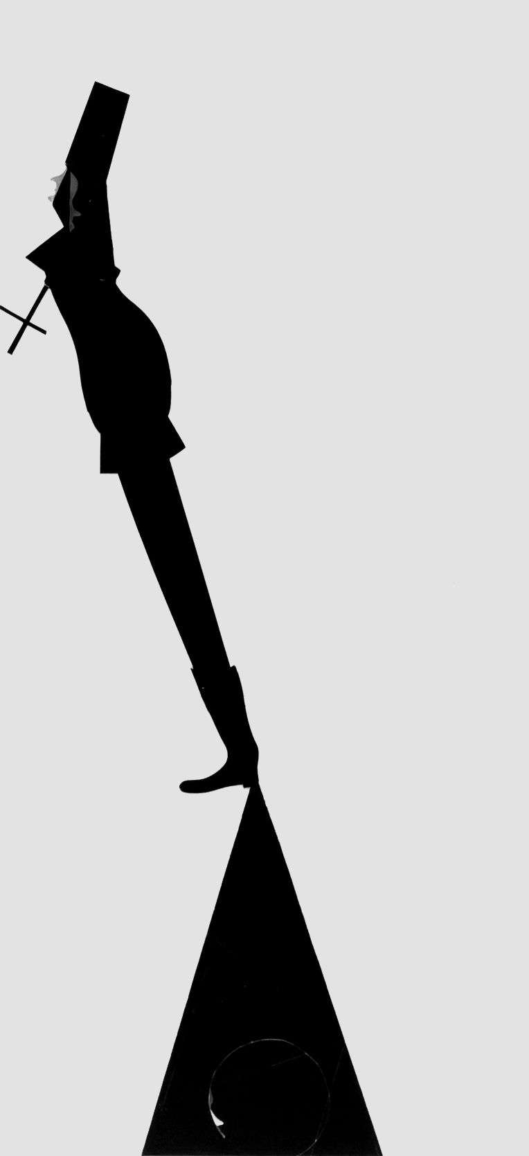 Tight-rope walking between a composition and an idea. The individual is trying to maintain his equilibrium on a steep church roof and tackle the advancing cross.
