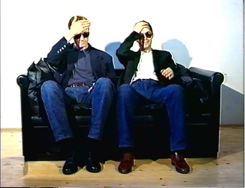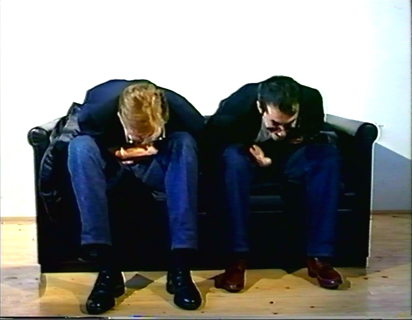 Two men of similar appearance – the one on the left the artist himself – try to imitate the gestures of the other. These mimicked movements are imperfect; they suggest disorientation and tend to turn into each man’s own gesture, again to be taken up by the other. All this involves quite a bit of good fun, but also contains a fair amount of reflection on the reprocessing of perception and the oscillation between what is one’s own and what is not, as well as the imperfection of replication.