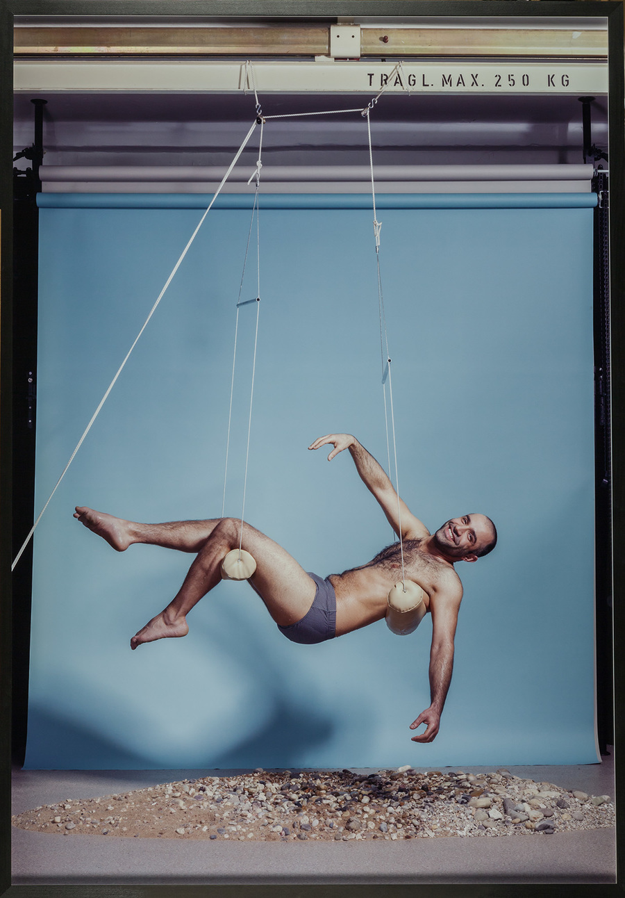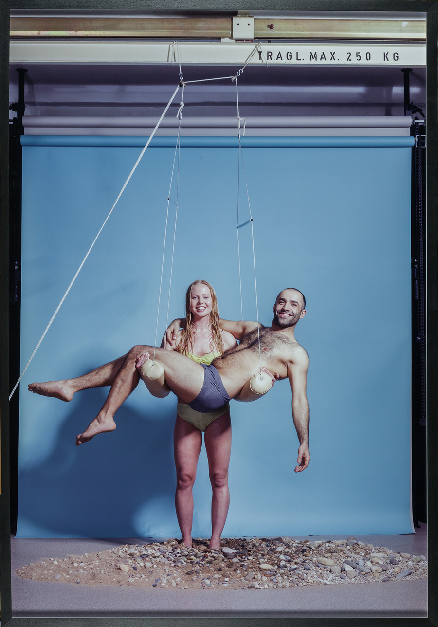 The triptych refers to a lost photograph from the 1960s, showing the artist’s mother and her Lebanese boyfriend. Fujiwara, remembering no more than the general composition of the representation – a woman carrying a man in her arms – employed the compositional scheme of the Pieta by Michelangelo. To recreate the pose, he used a purpose-built structure and introduced some stage props to suggest that the action was taking place on the beach. The resultant photographs appear all the more artificial due to the differences in ethnic origin of the protagonists. The work has a political and social dimension; the eponymous King Kong complex is a reference to the stereotypical set of characteristics of a Middle Eastern male, which the artist used in selecting his male model.