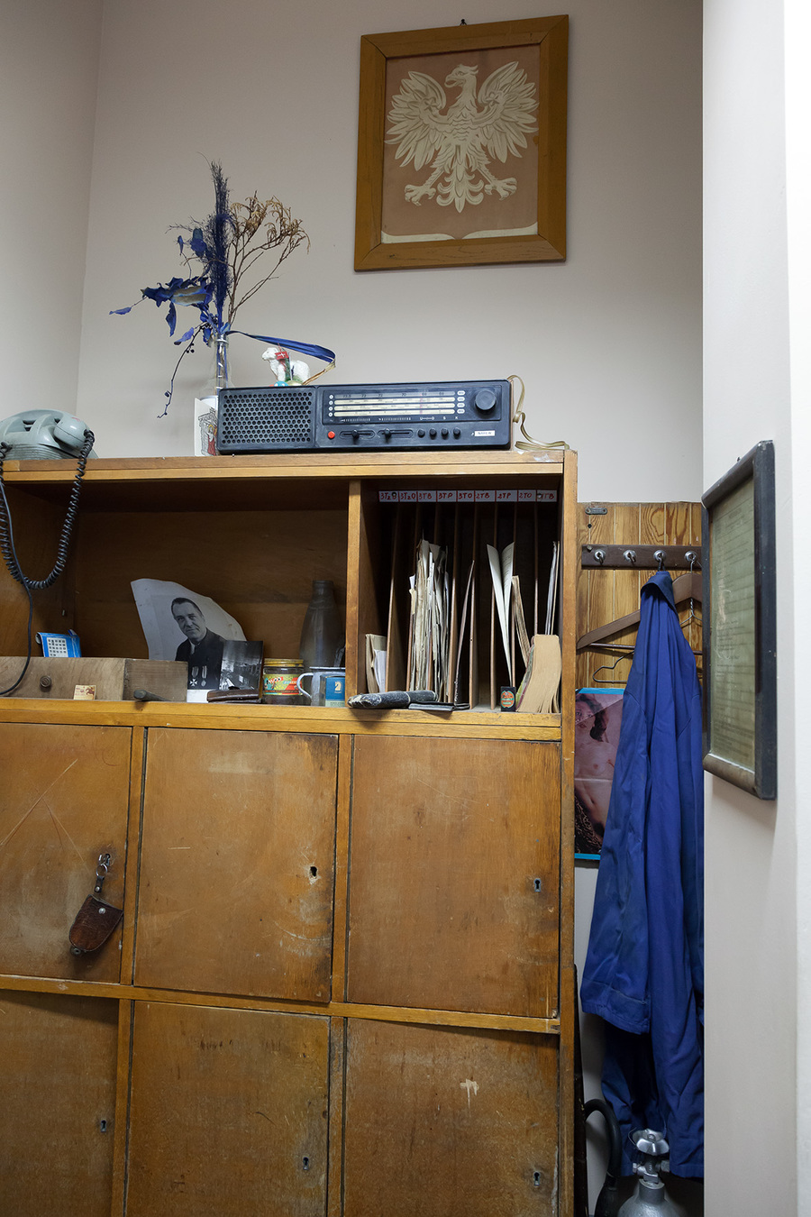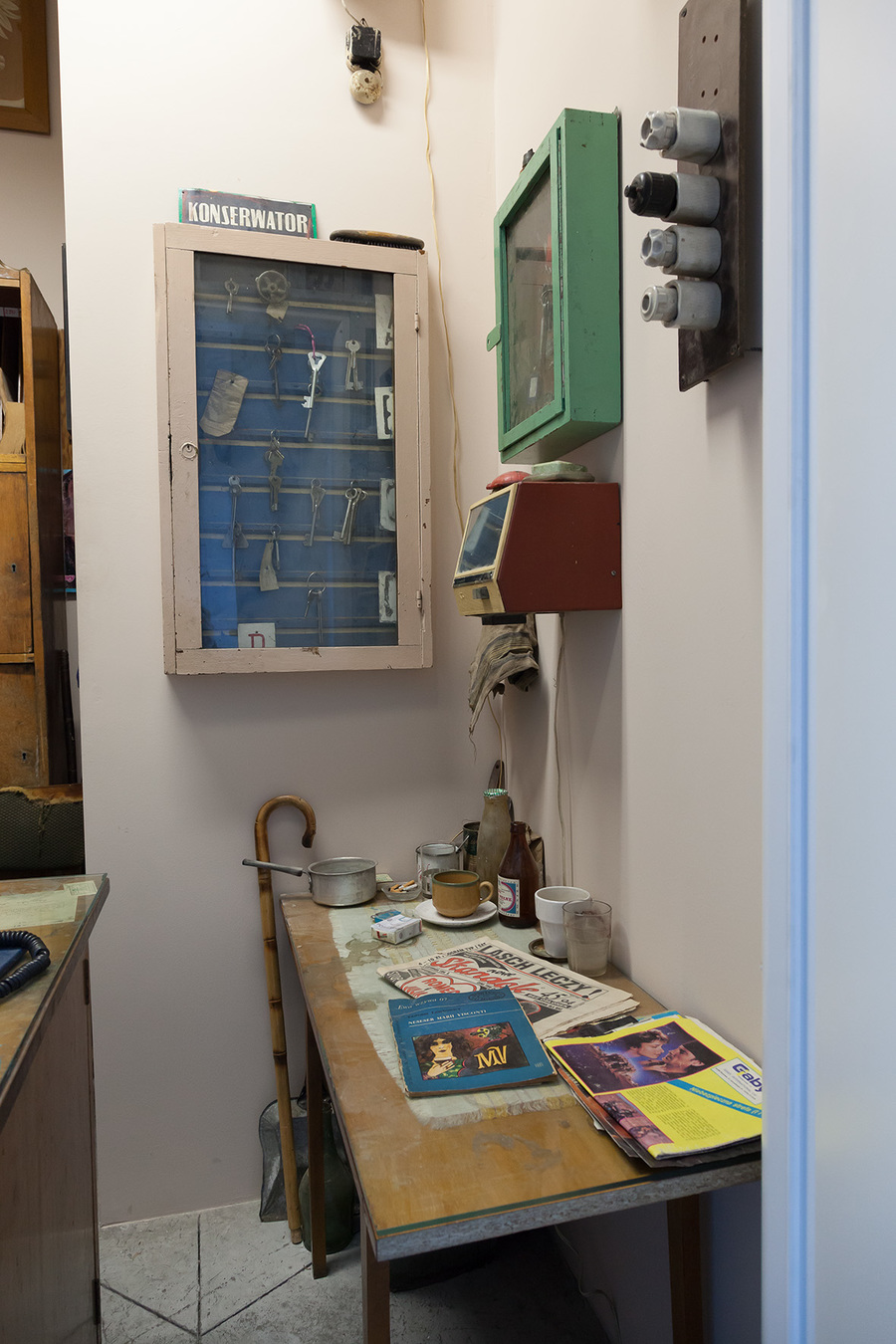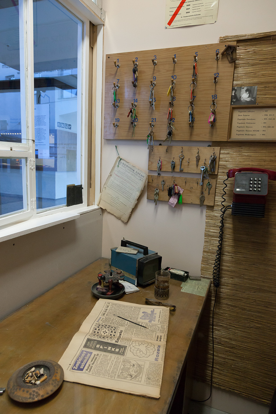 This work was first presented at the office of Gazeta Wyborcza in Lublin, and a disused reception office was used for this purpose. Apart from paraphernalia typical of the time of the People’s Republic, the interior also contains some props that look like personal belongings of the staff working on the reception desk. A place that – during the day – has the formal cold and dispassionate function of providing information, becomes during the night a space of freedom, free from anybody’s interference. The work takes on board the issue of the restrictions and closing off that we accept in taking up a particular form of employment.