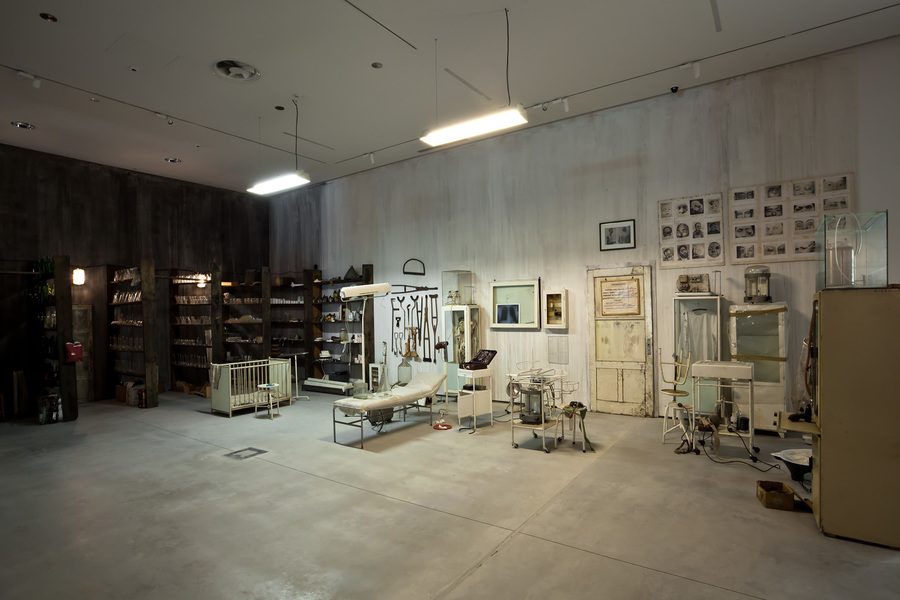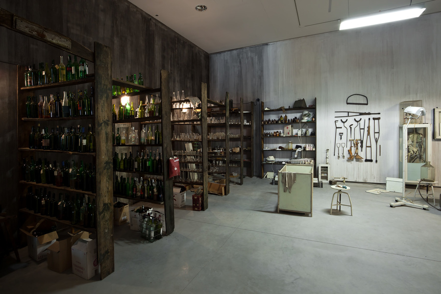 A cross between a doctor’s surgery and the contents of a cellar. Objects, the primary function of which was to provide a cure, appear as toxic and harmful as those discarded to the cellar.