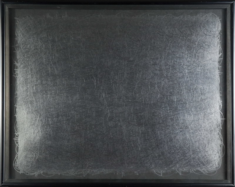 The work juxtaposes an orderliness and adherence to rules and regulations with the freedom and autonomy of drawing. A freehand line subjugates its chaotic passage to the space of the sheet of paper. The drawing becomes a notation of a concept, and also of the emotions of its creator.
