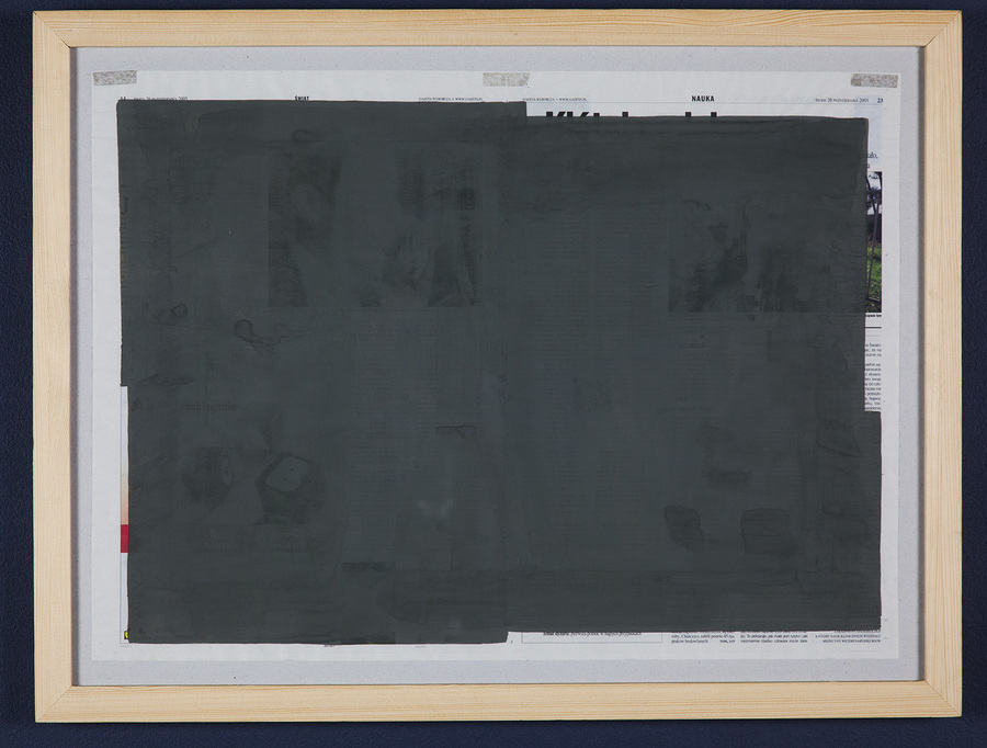 The installation is part of a larger series with the same title, produced during 2008–2009, which comprises hundreds of pages of newspapers from all over the world, painted over in different colours. By covering up the printed texts with watercolour, the artist has undermined the validity of press information. This novel, creative way of putting the paper on which the news had been printed to another use is a reference to the concept of recycling.