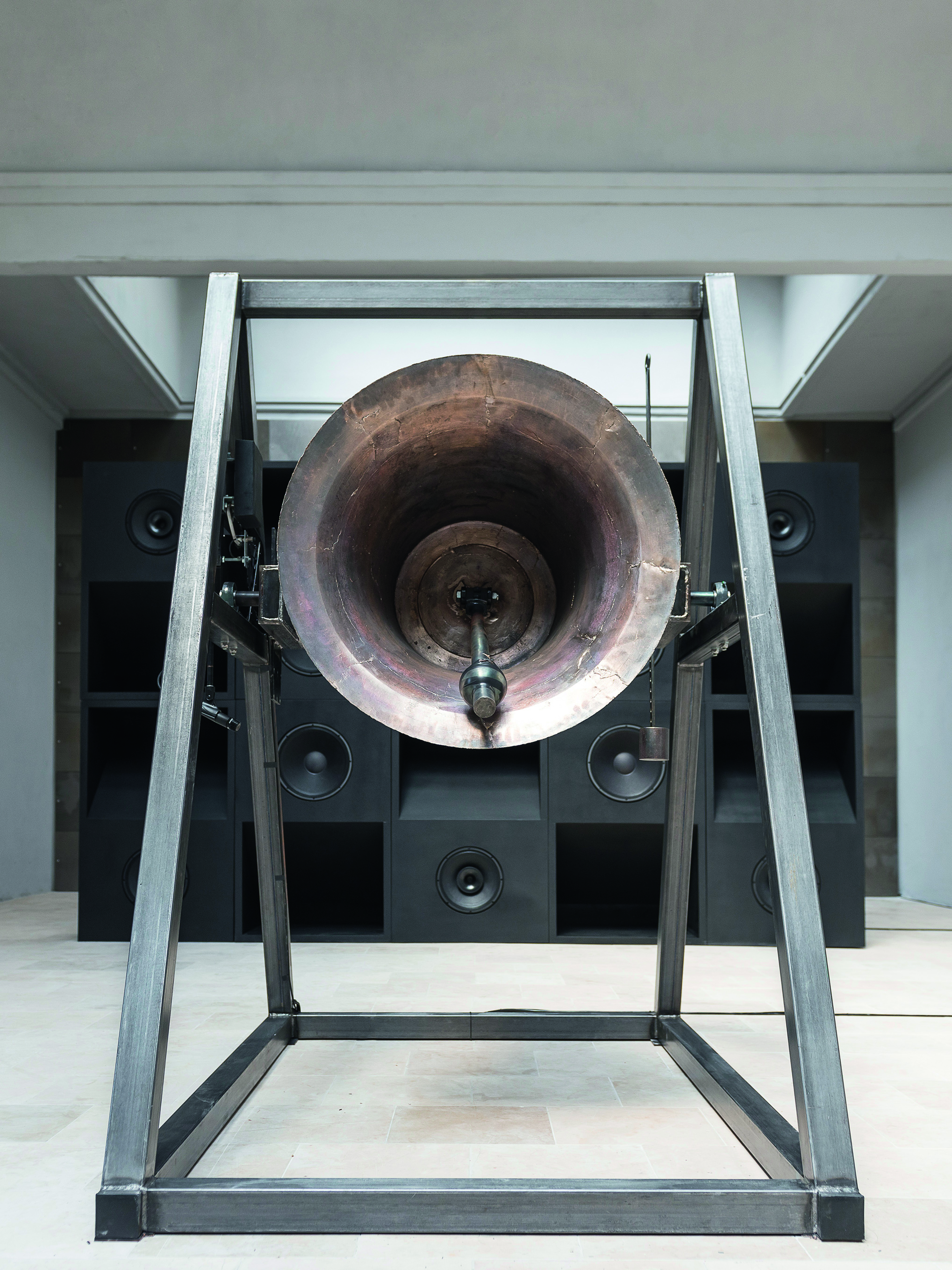 The oft-repeated catchphrase of the project was ‘what you see is what you get’. The lack of anecdote and the raw structure of the work, based on the materiality and programmed function of each of its elements – bells, microphones, loudspeakers and bass shakers, as well as the auditorium for the audience in Biel/Bienne and Warsaw – were key features for us. The size of the individual modules of the work – as in the presentation at MOCAK – creates the environment for experiencing the Everything Was Forever... cycle. The first movement belongs to two bells placed on both sides of the long gallery, custom-made according to Smoleński’s design in the Kruszewski brothers’ bell foundry. The actuator that sets the bells in slow motion initiates the first part of the composition. Microphones transmit the sound from the gallery – both all intentional and accidental noises – to be processed according to a strictly defined procedure. The effect of these procedures returns to the space and is emitted by monumental loudspeakers, and in the last part also by shakers. The cycle ends and begins again at specific intervals, and the silence that accompanies the wait for the next setting of the process in motion is an integral part of the project – on an equal footing with the sound filling the gallery.