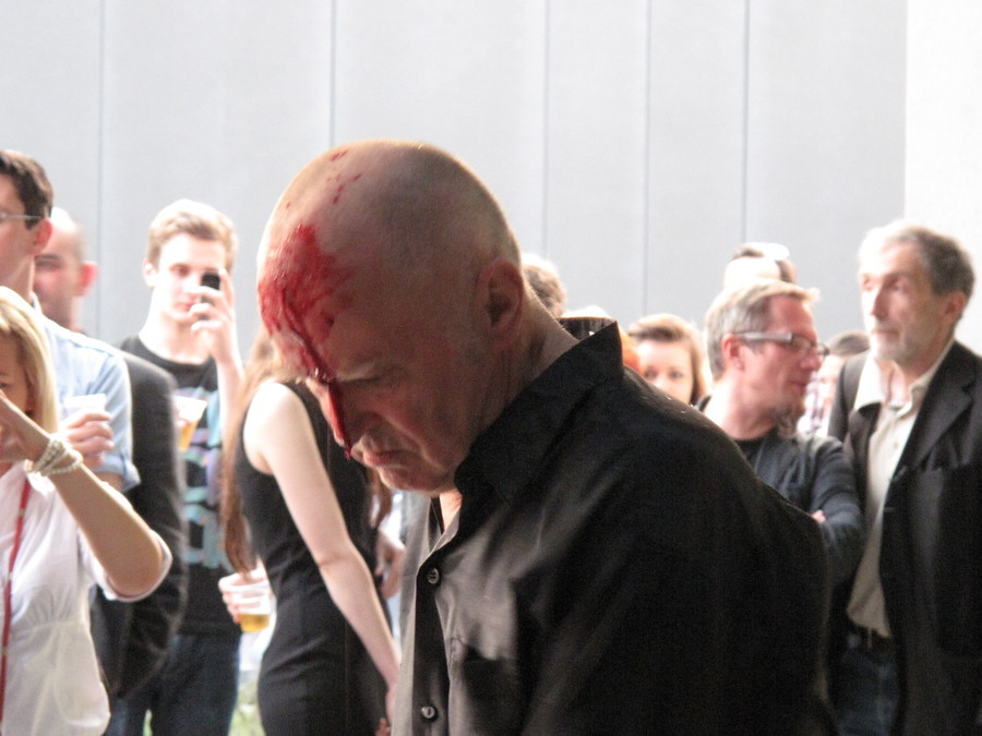 At 7.30 pm in the MOCAK courtyard, the renowned classical German artist Boris Nieslony presented Feather fell down on Krakow, a performance dedicated to the victims of genocide. Nieslony smashed forty window panes on his head while one of the spectators read out a list of 40 countries where human rights are brutally broken.