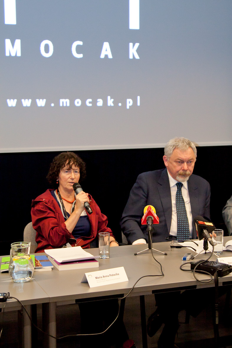 On the 19th May at 1 pm MOCAK opening press conference took place, conducted by the journalist Roman Kurkiewicz. Those seated at the conference table were the President of Krakow Jacek Majchrowski, MOCAK’s Director Maria Anna Potocka, Tomasz Gutkowski – the Director of Krakow Photomonth, Professor Jerzy Porębski, Adam Mazur (curator of the exhibition Maurycy Gomulicki. Bibliophilia and Delfina Piekarska (curator of the exhibition the Award of the Vordemberge-Gildewart Foundation, as well as Assistant Curator of the History in Art exhibition).