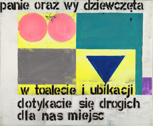 Paweł Susid: Over the years, it changed. Today, I am motivated to paint by a sentence or a thought. I am pretty lazy, expedient; I like to lie down, read. I used to wake up with some funny or serious word or a sentence. Or I came up with a great idea in the morning, while jogging. I left home sleepy and I came back with an image or an idea for a painting. Sometimes, it was also a provocative sign or symbol. Such was the case of the national signs of women's and men's lavatory, to which I added text: "Ladies and you girls, in bathroom and the lavatory you touch places that that are dear to us." To one of the paintings of Strzemiński, I only added "Two fine girls". Looking at this picture, I clearly saw a profile of a woman, so I just wanted to supplement the form created by the painter. Similarly, one of the Crosses of Kazimierz Malewicz appeared to me as something similar, so I just added "The design of table for 4 persons."
