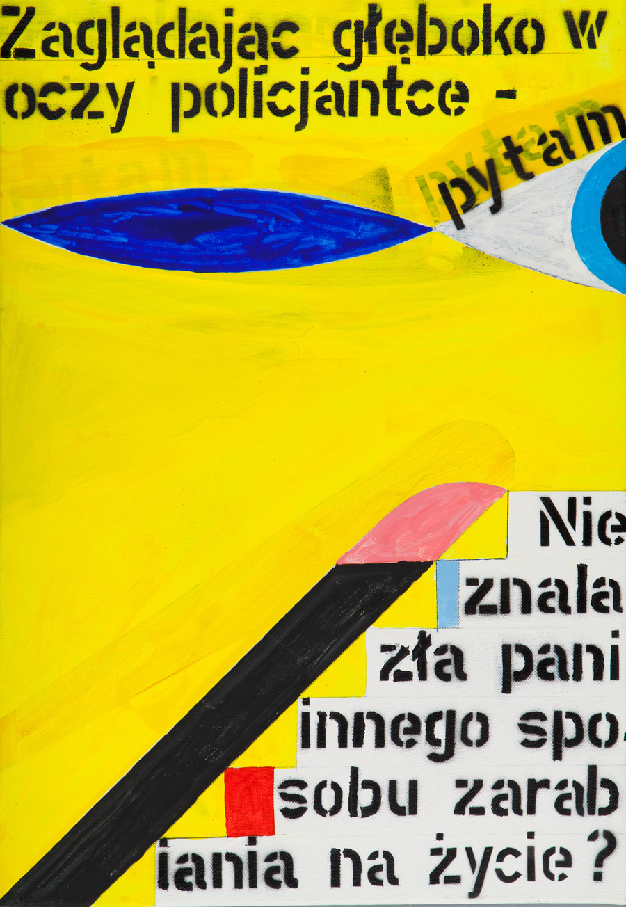 And now back to the first question. What does inspire me more: the content, image or form? Perhaps my attitude to the template indicates that what I care about is only the subject, content and story. It even happened that I sat in front of several canvases of various formats and I painted the same theme on all of them, and later I chose the best one. After a while, I discovered the others and was not able to find what I disliked in them previously. My work Ladies and you girls, in bathroom and the lavatory you touch the places that are dear to us I also painted simultaneously on two canvases. Both of them were on display in Zachęta. The idea was to show that it is purely an artistic exercise to a given text. I can paint something even twice, if the painting is nice. You can paint a picture for the second time, because the role of the handcraft in painting has long since changed. I am not looking for forms in the painting. I rather hope that I can find the functional and acceptable forms by chance.
