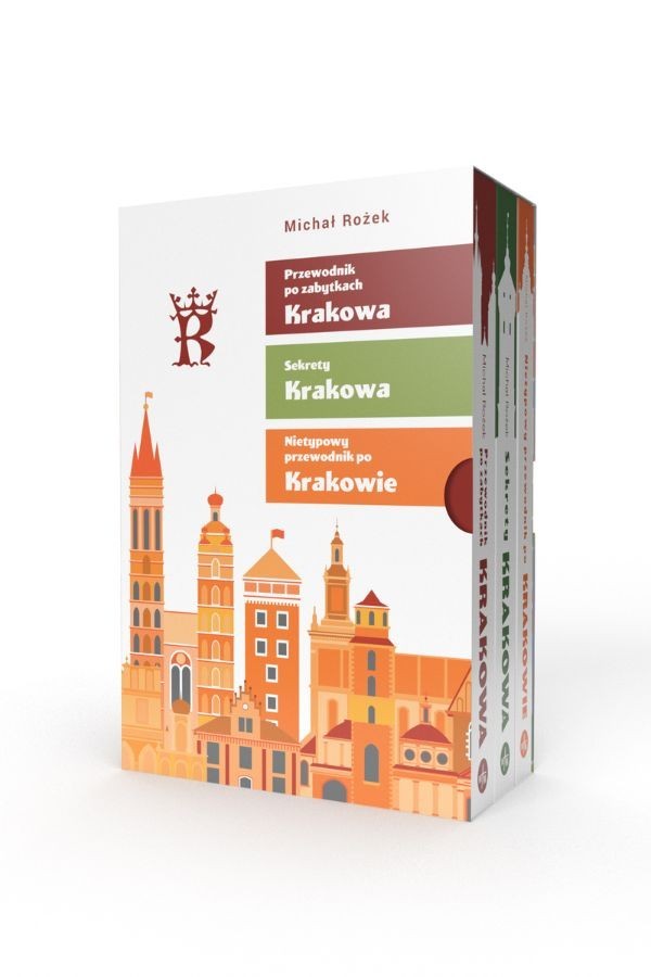 Pudełko zawiera książki: Sekrety Krakowa, Przewodnik po zabytkach Krakowa, Nietypowy przewodnik po Krakowie.