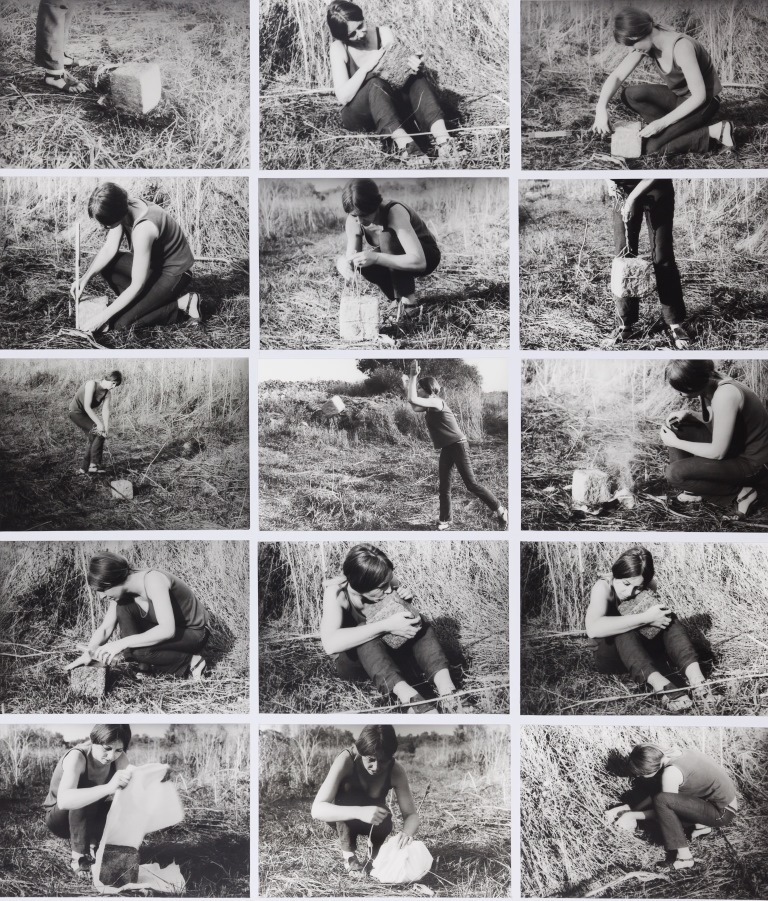 The work is a photographic documentation of a performance carried out by the artist in 1971. 15 prints, arranged in five rows, three in a row, step by step present actions involving a single paving stone. The work, with its roots in conceptualism, also has feminist and political connotations. A paving stone is commonly used as weapon in street protests. During the performance, the artist embraces, strokes and kisses the stone, treating it with great care, then wrapping it tightly in a straw net or throwing it vigorously.
