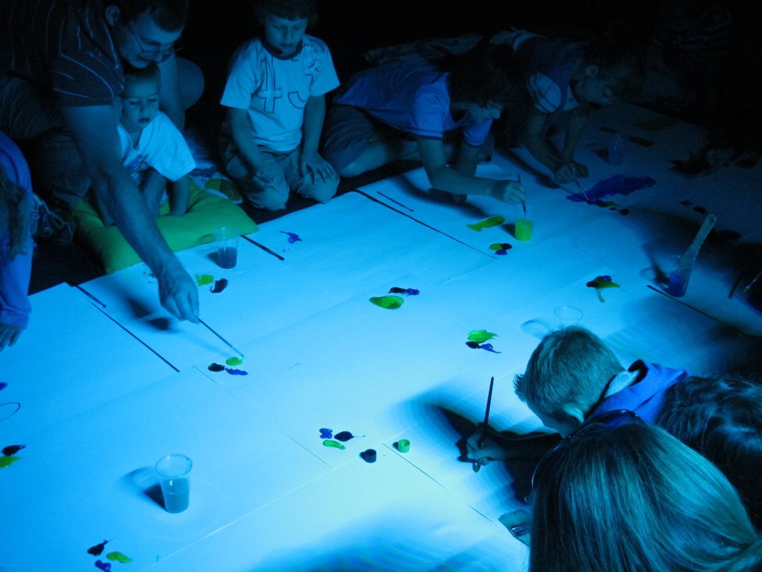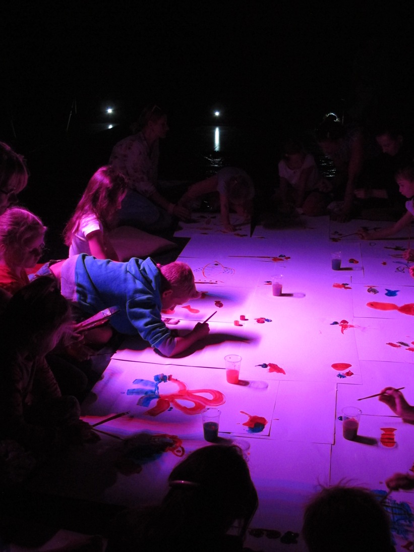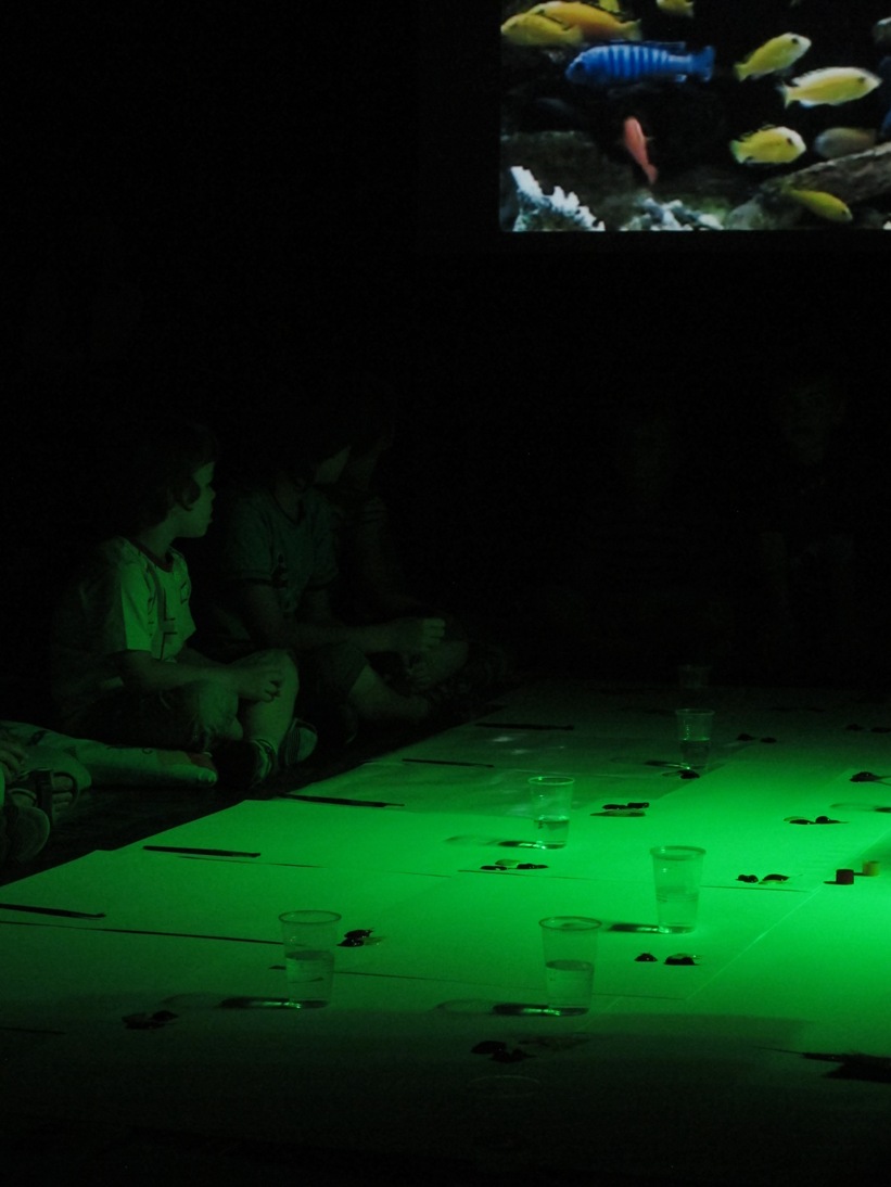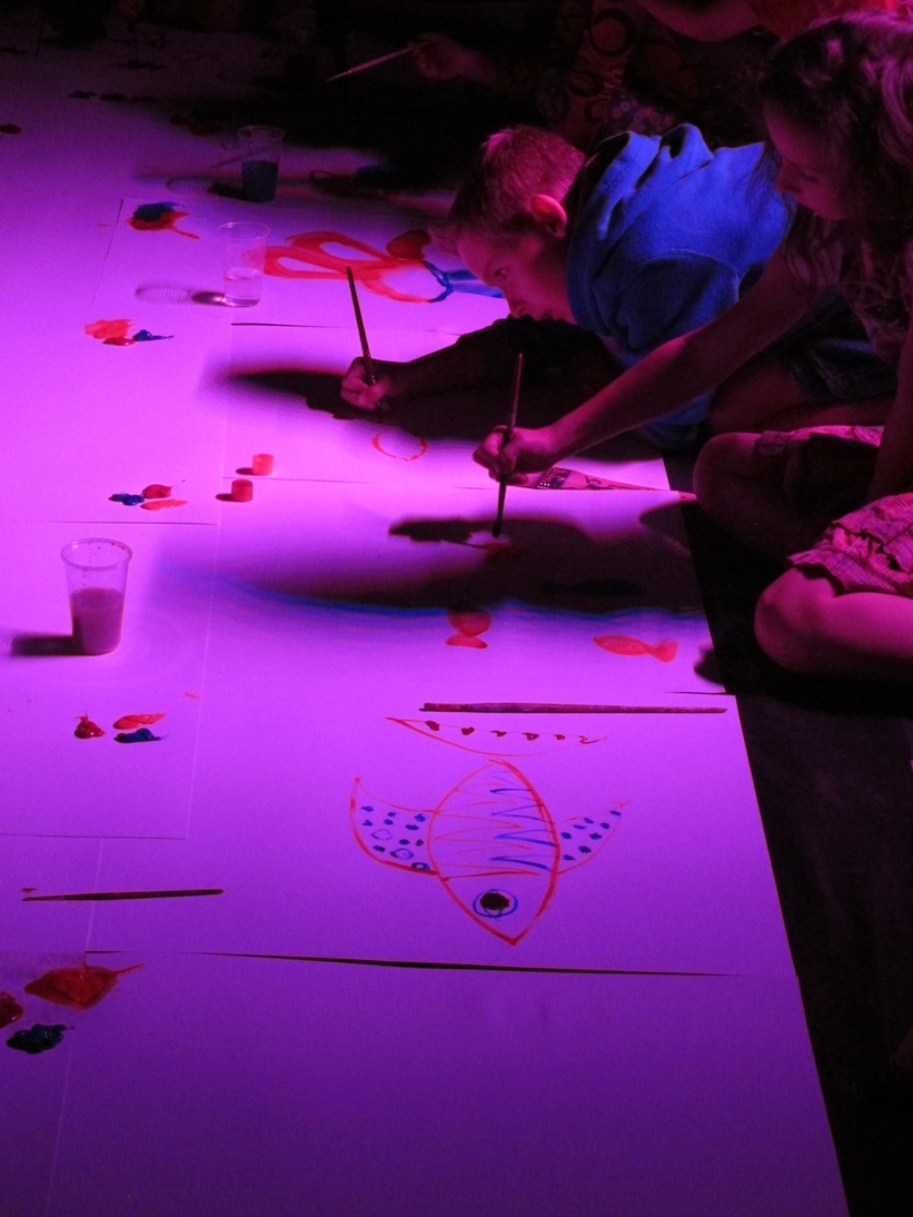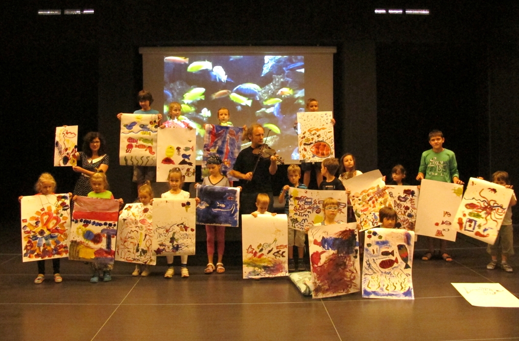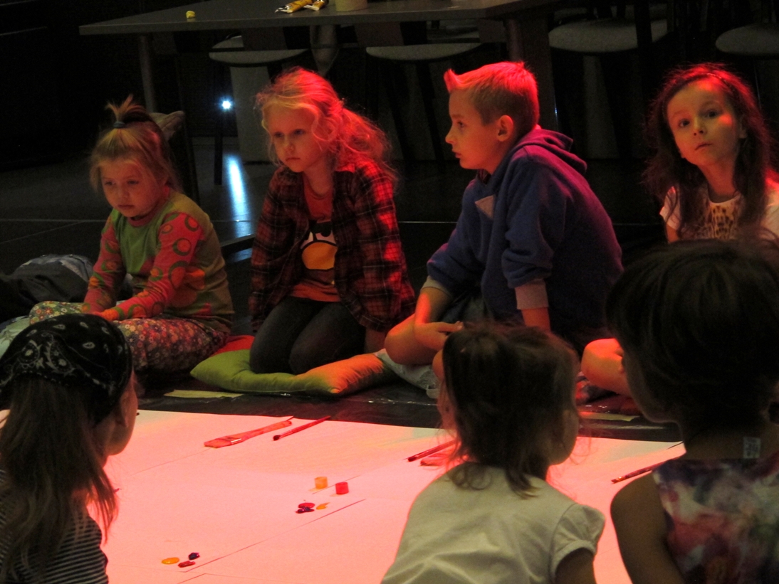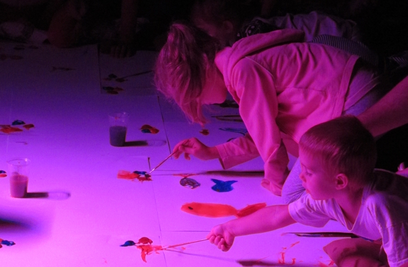 On Saturday 24 August 2013 there took place a workshop for children with the artist Piotr Lutyński. The participants familiarised themselves with two exhibitions: Economics in Art and Territory. After viewing the first one of these, the artist invited the group to the Alfa Gallery at MOCAK, which for the duration of the exhibition Territory had become a ‘room inhabited by a stag’. In the Gallery the children viewed the installation and the paintings that Piotr Lutyński had painted for animals. Next, with colourful illumination and under the artist’s guidance the children created paintings of sea creatures, their colours transforming every time the colour of the lights changed. To culminate the session, the artful net of Piotr Lutyński’s music caught a colourful shoal of fish and other sea creatures.