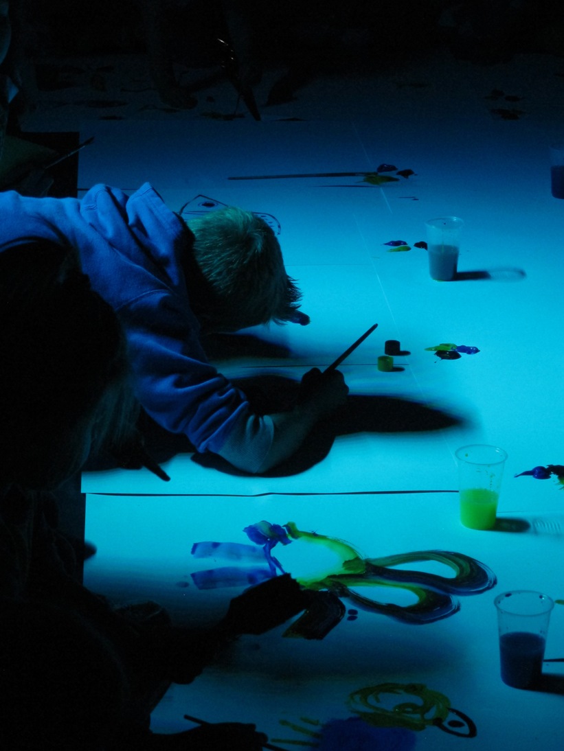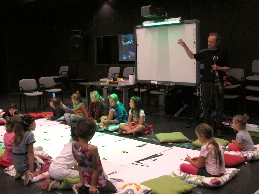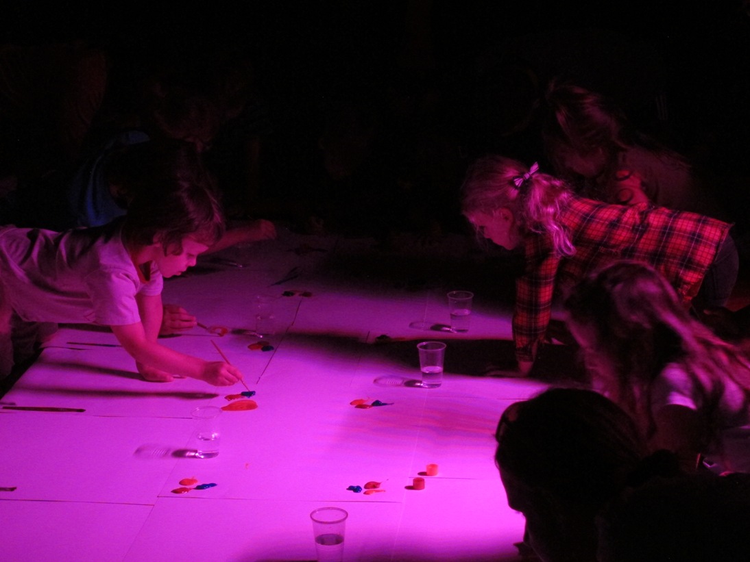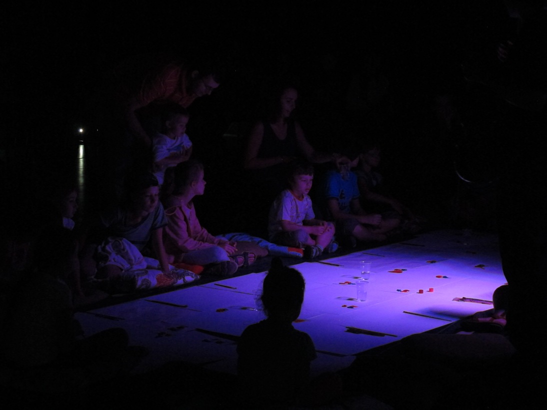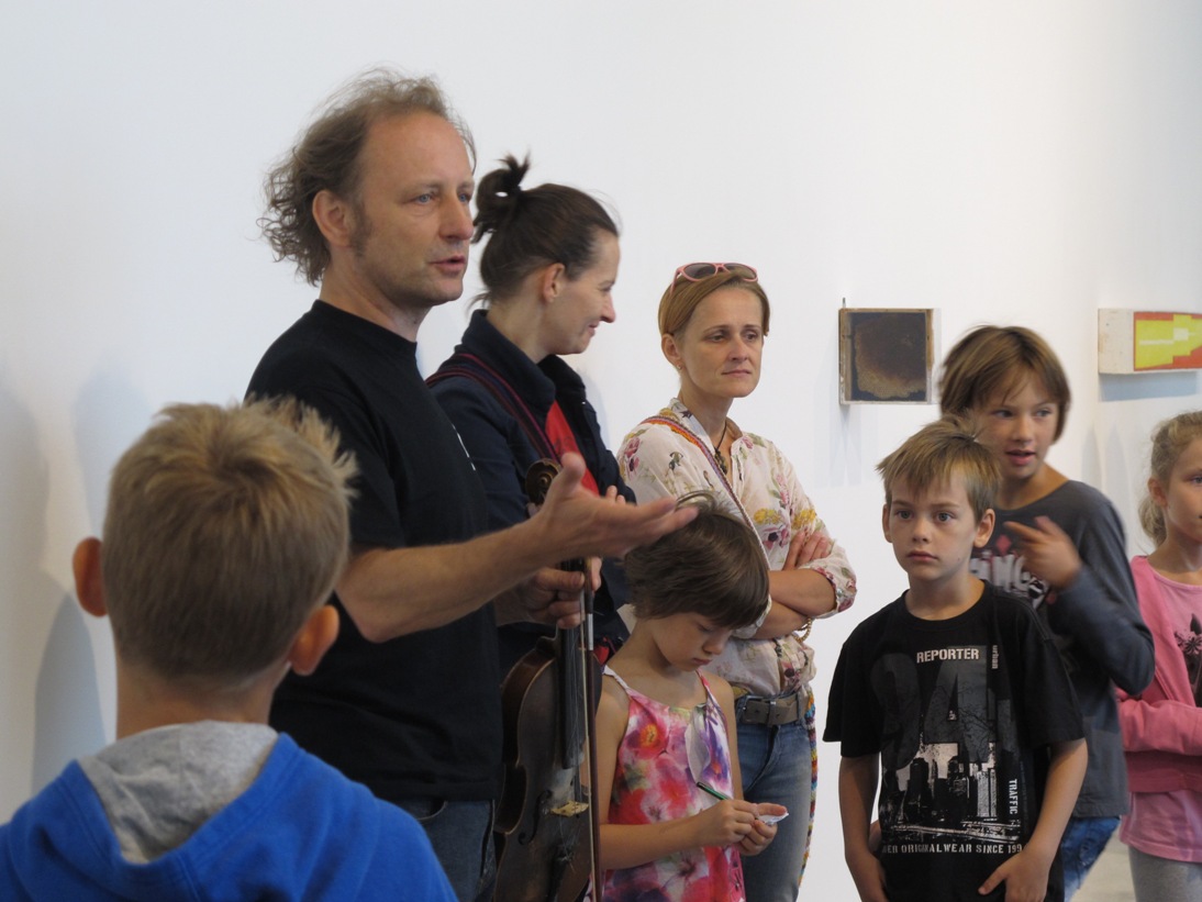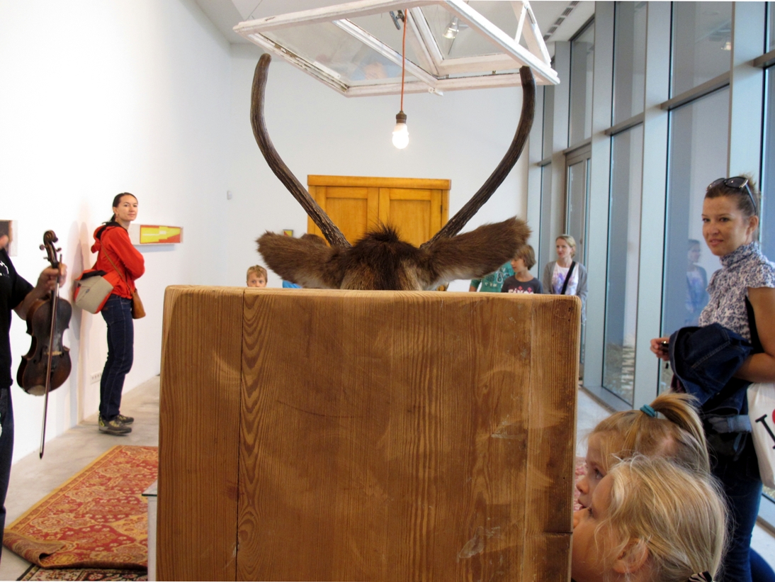 On Saturday 24 August 2013 there took place a workshop for children with the artist Piotr Lutyński. The participants familiarised themselves with two exhibitions: Economics in Art and Territory. After viewing the first one of these, the artist invited the group to the Alfa Gallery at MOCAK, which for the duration of the exhibition Territory had become a ‘room inhabited by a stag’. In the Gallery the children viewed the installation and the paintings that Piotr Lutyński had painted for animals. Next, with colourful illumination and under the artist’s guidance the children created paintings of sea creatures, their colours transforming every time the colour of the lights changed. To culminate the session, the artful net of Piotr Lutyński’s music caught a colourful shoal of fish and other sea creatures.