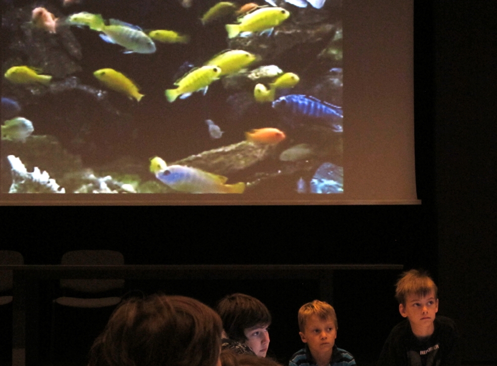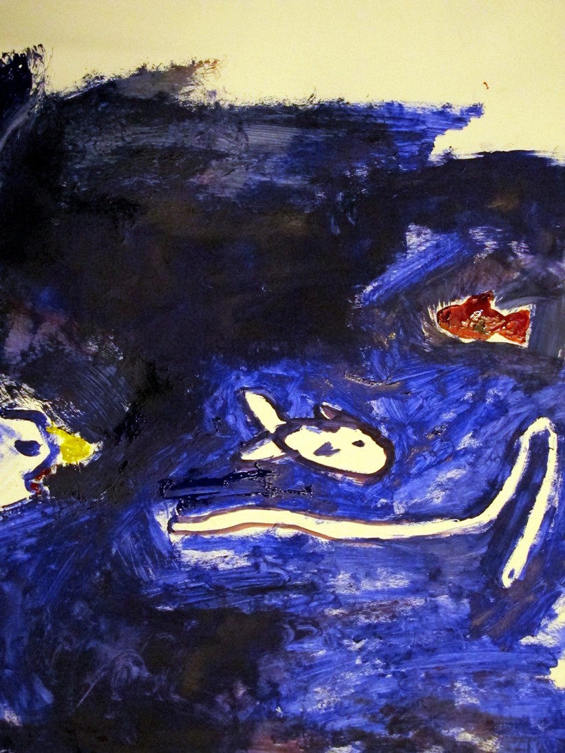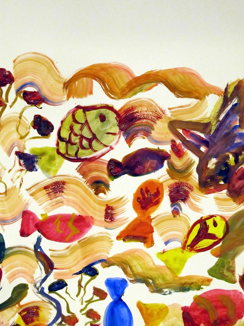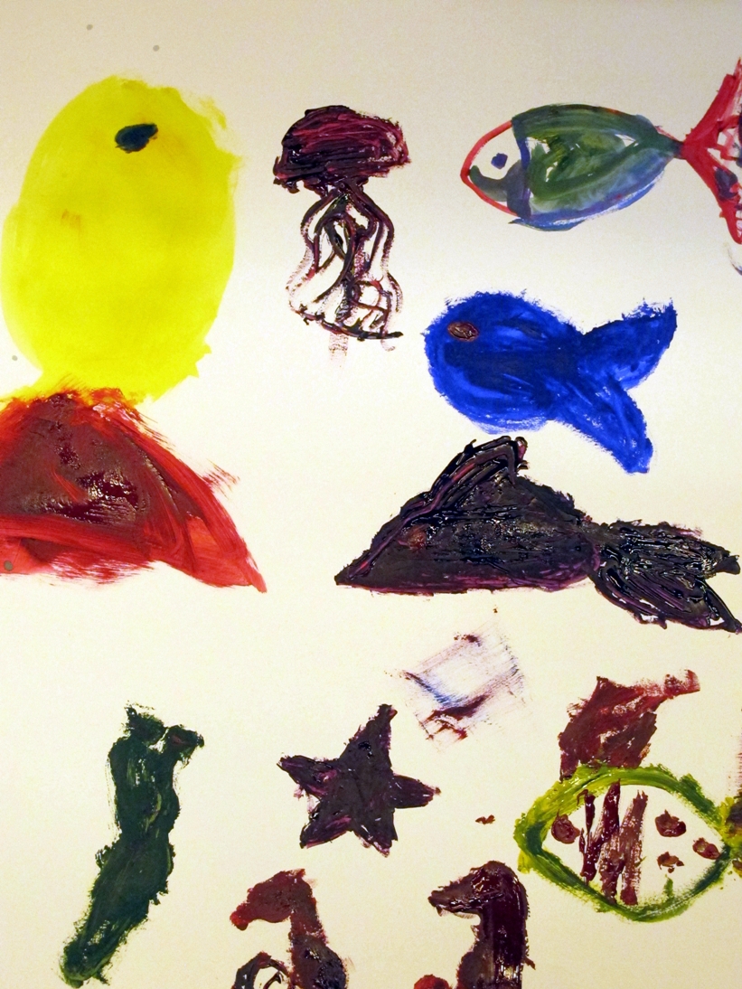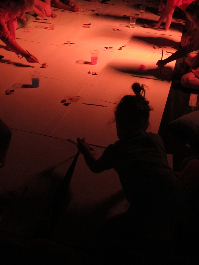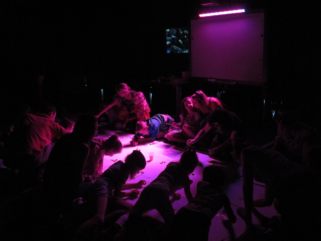 On Saturday 24 August 2013 there took place a workshop for children with the artist Piotr Lutyński. The participants familiarised themselves with two exhibitions: Economics in Art and Territory. After viewing the first one of these, the artist invited the group to the Alfa Gallery at MOCAK, which for the duration of the exhibition Territory had become a ‘room inhabited by a stag’. In the Gallery the children viewed the installation and the paintings that Piotr Lutyński had painted for animals. Next, with colourful illumination and under the artist’s guidance the children created paintings of sea creatures, their colours transforming every time the colour of the lights changed. To culminate the session, the artful net of Piotr Lutyński’s music caught a colourful shoal of fish and other sea creatures.